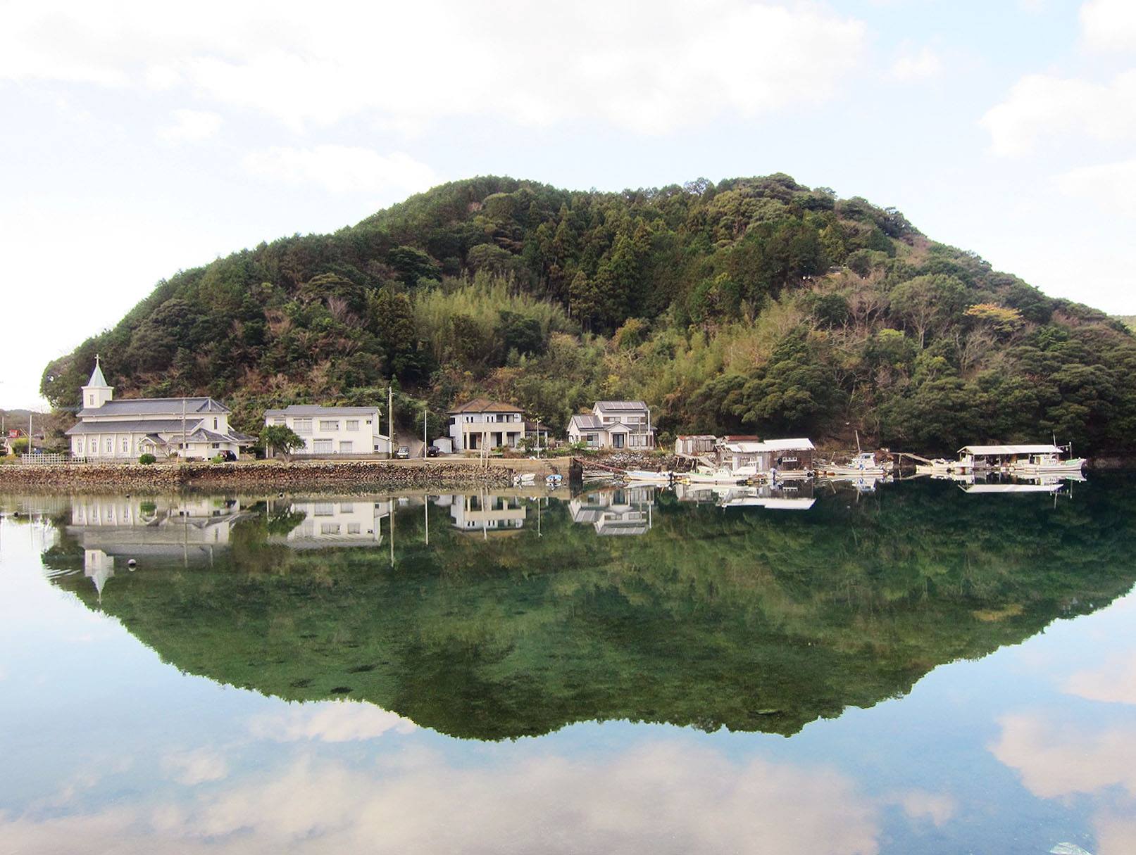 新上五島的教會建築各有特色,像是以石頭堆疊建造的頭之島天主堂、帶有復古紅磚色彩的青砂浦教會、以及在水面上倒映著美麗身影的中之浦教會等等。